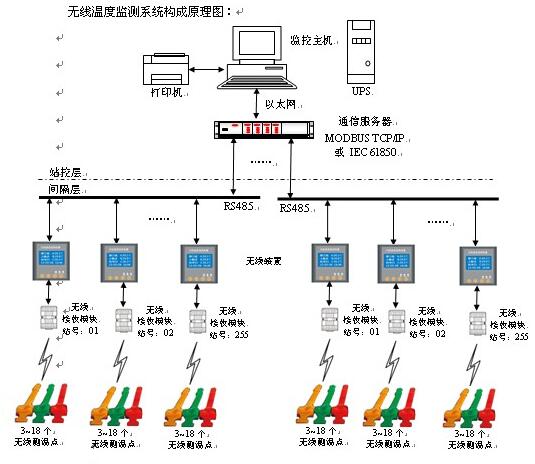 3、無線測溫指示器(或無線測溫盒)實時采集溫度,越限時立即通過無線跳頻方式主動上報。當溫度變化不大時,測溫指示器每隔一段時間主動上報一次當前溫度值。